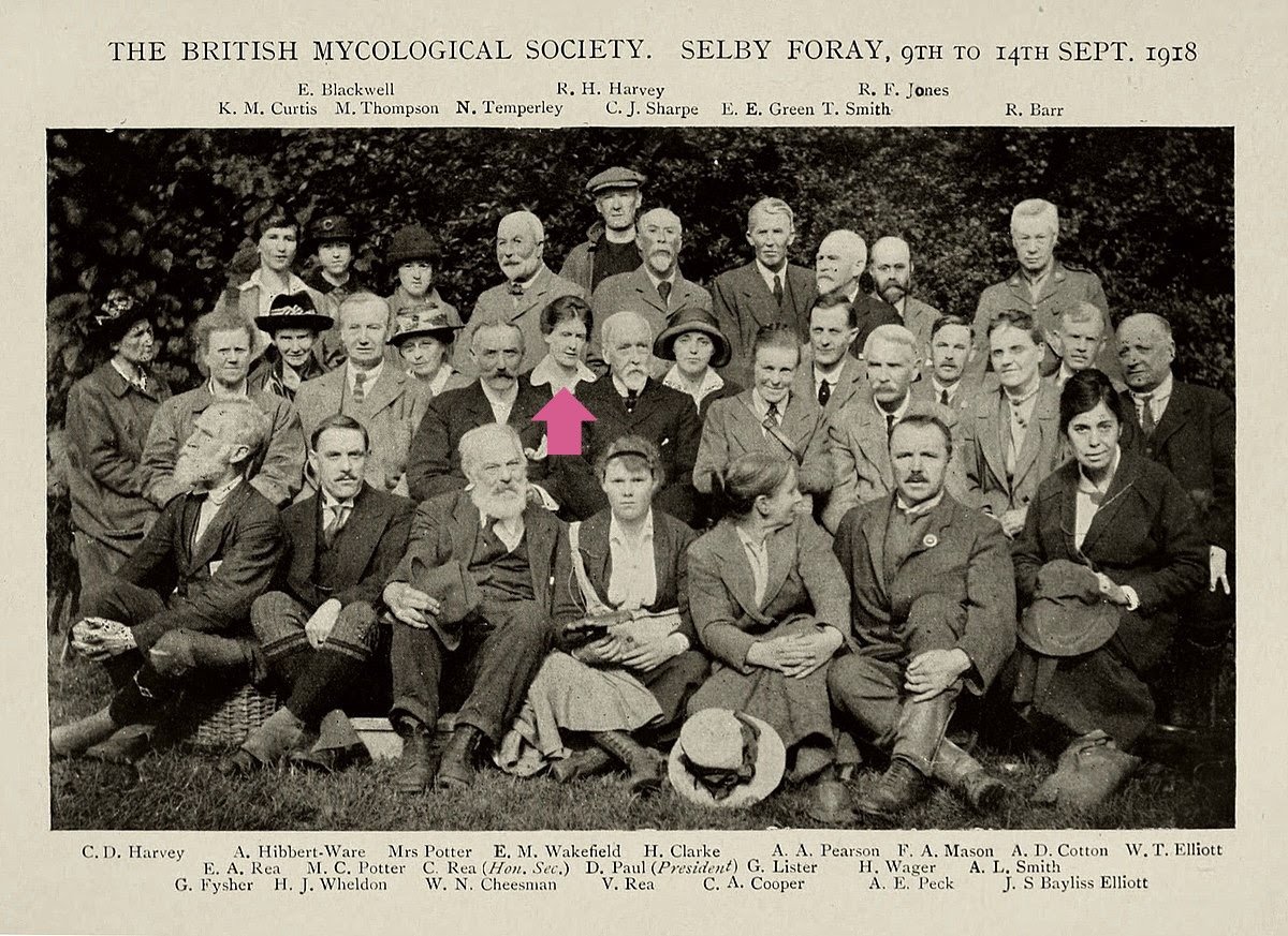 Foto de grupo de la British Mycological Society (1918). Elsie Maud Wakefield aparece señalada.