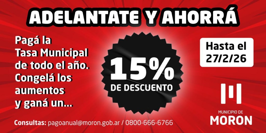 El Municipio de Morón informó que las y los contribuyentes que abonen de manera anticipada el importe total correspondiente a las tasas municipales del año 2026 podrán acceder a un descuento del 15% sobre el valor anual estimado. El beneficio estará vigente para quienes realicen el pago completo hasta el próximo 27 de febrero.