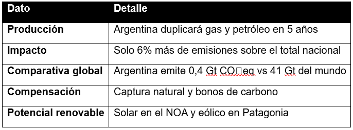 Informes de la Academia Nacional de Ingenieria y del Instituto de Energía de la Universidad Austral revelan que el plan para duplicar la producción de gas y petróleo en cinco años tendrá un impacto mínimo en las emisiones de CO2, y podrá compensarse especialmente con soluciones basadas en la naturaleza y limitando fugas con tecnología. El país combina crecimiento económico con transición energética.